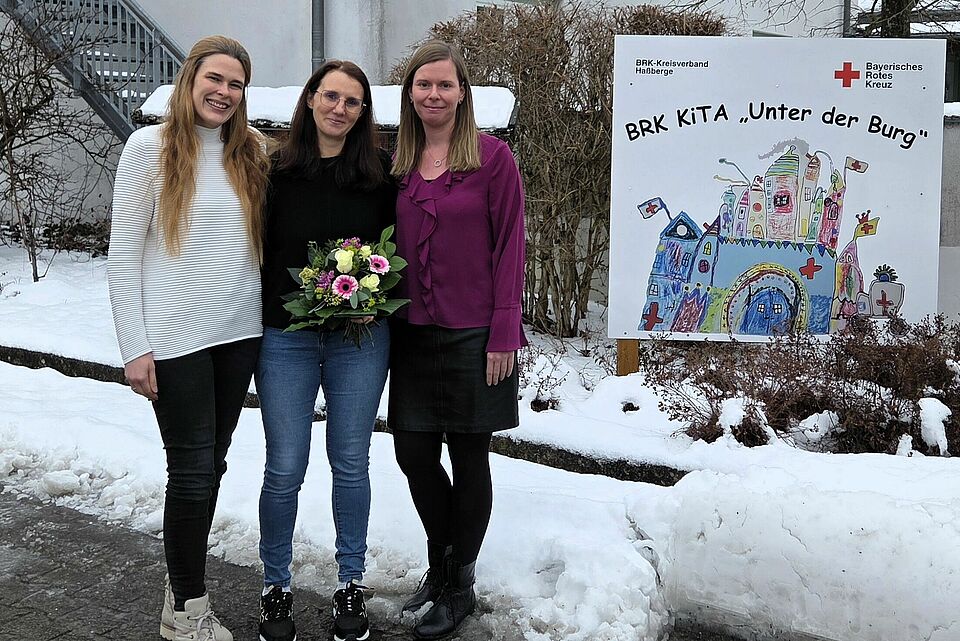 Bettina Klebrig (Mitte) leitet seit 20 Jahren die BRK-Kita "Unter der Burg" in Königsberg. Die Ehrung erfolgte mit Übergabe eines Geschenks durch BRK-Kreisgeschäftsführerin Carina Küfner (links) sowie Teamleiterin Susanne Häffner (rechts). Foto: Lenny Schmidt / BRK