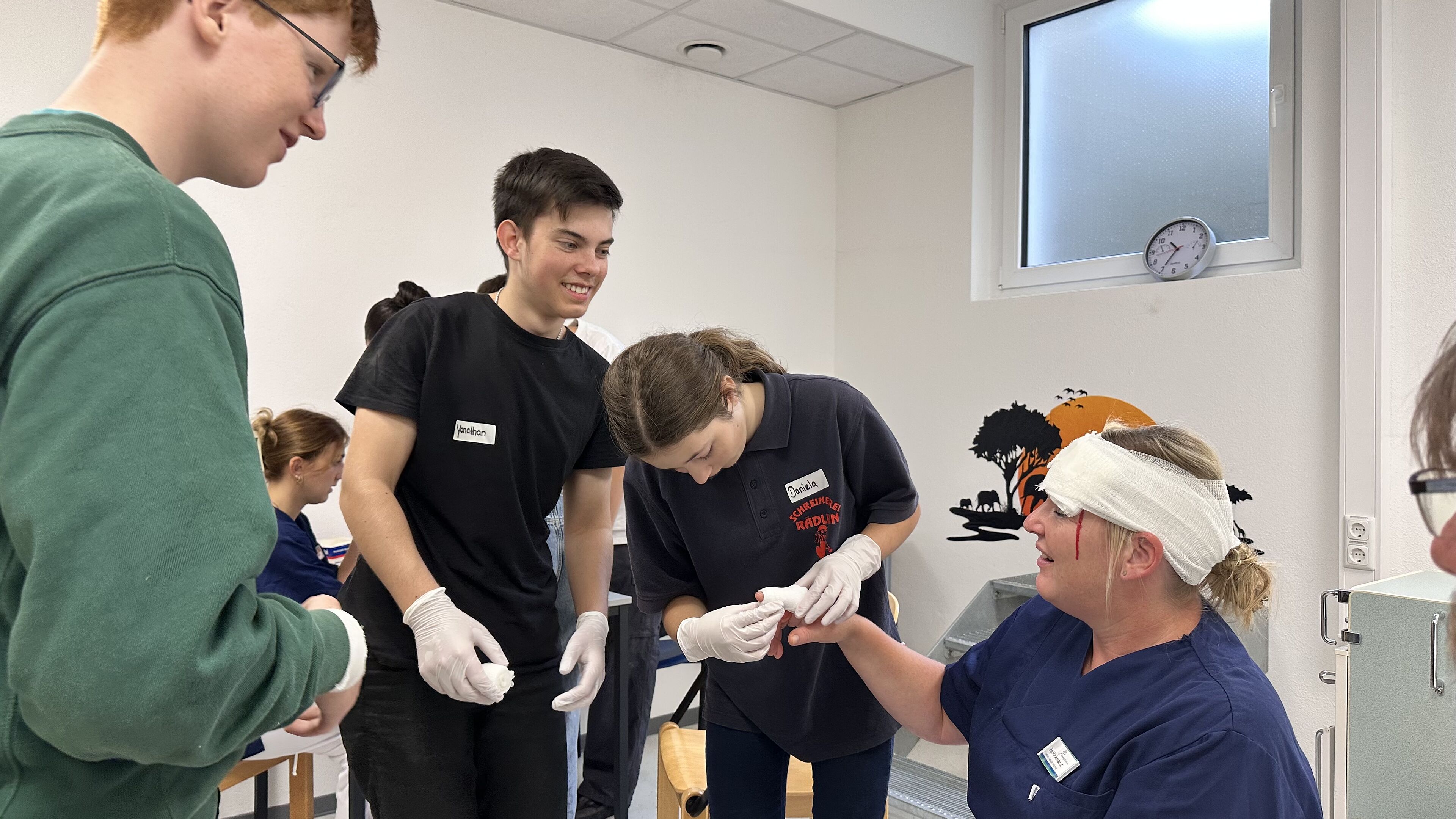 Dazu rät auch Simone Gilley, ebenfalls Lehrbeauftrage der Berufsgenossenschaften für den Fachbereich Erste Hilfe (EH), die gemeinsam mit ihren EH-Ausbilder-Kollegen Tina Jäger, Günther Schleelein sowie Marius Kleilein, der eine Ausbildung zum Notfallsanitäter absolviert, zum Aktionstag gekommen war. Denn der Großteil aller medizinischen Notfälle ereignet sich nicht im Straßenverkehr, sondern zuhause oder am Arbeitsplatz. Damit sind Familienangehörige oder Arbeitskollegen oft die ersten, die einem Betroffenen Erste Hilfe leisten müssen. Wer dann fit ist und die wichtigsten Handgriffe kennt, kann einerseits kompetente Hilfe leisten, andererseits auch die eigene Nervosität und Sorge auf ein Mindestmaß begrenzen. „Schulsanitäter sind deshalb Vorbilder für ihre Mitschülerinnen und Mitschüler, aber auch für die gesamte Gesellschaft“, bringt es Simone Gilley auf den Punkt.