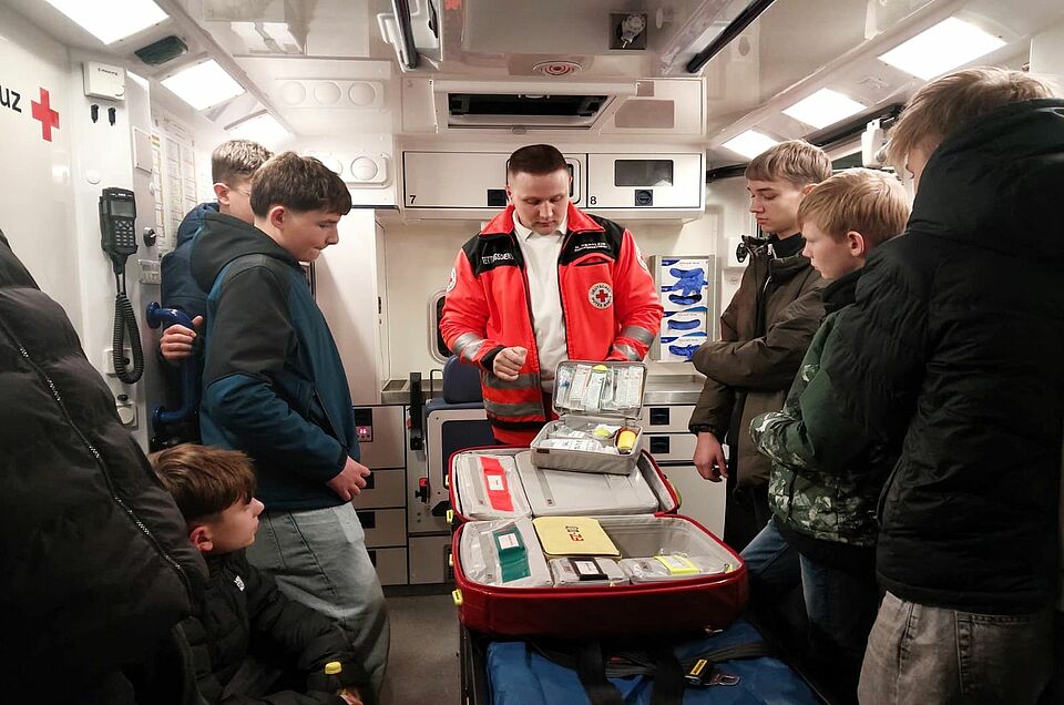 Niklas führte die Jugendlichen durch die Rettungswache und zeigte die Räumlichkeiten. Zudem konnten die Mädchen und Jungen einen genauen Blick in einen Rettungswagen und Krankentransportwagen werfen und ebenso das Notarzteinsatzfahrzeug in Augenschein nehmen. Fachkundig erklärte Niklas dabei die Unterschiede zwischen den einzelnen Fahrzeugen, wann sie zum Einsatz kommen und mit welchem Personal sie im Einsatz besetzt sind. Ebenso gab es Informationen zum Berufsbild des Notfallsanitäters und der Arbeit von Rettungssanitätern.