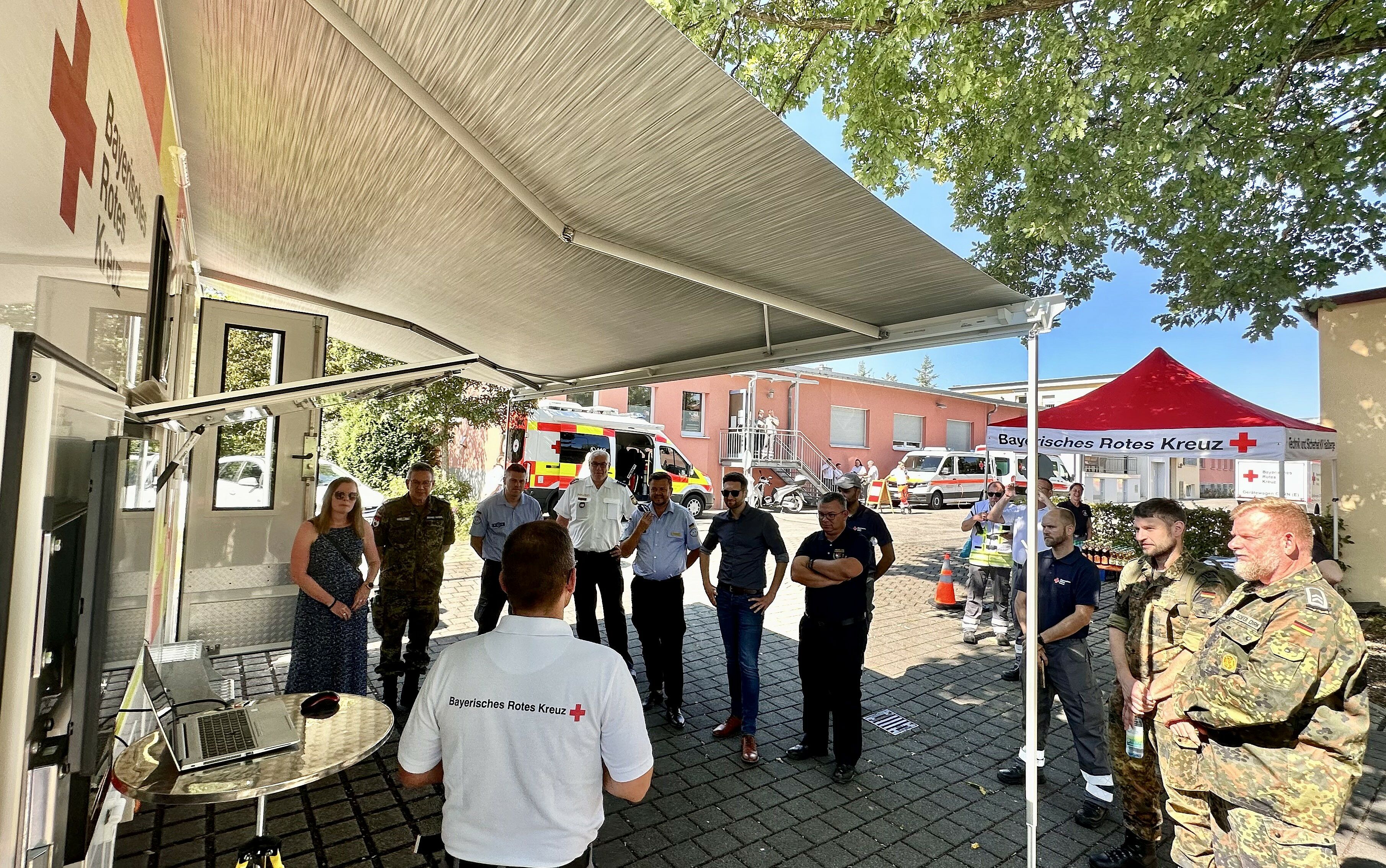Um die Arbeit im Rahmen der Katastrophenschutz-Übung vorzustellen, hatte das Rote Kreuz Gäste von Behörden und anderen Organisationen eingeladen. Sie wurden am Mittag im Beisein der stellvertretenden BRK-Kreisgeschäftsführerin Carina Küfner von den beiden Katastrophenschutz-Beauftragten des BRK-Kreisverabandes Haßberge, Wolfgang Zweverink und seinem Stellvertreter Jürgen Geisel, begrüßt. Zweverink sowie Kontingentführer Christian Krämer gaben den Ehrengästen einen Überblick über Sinn und Zweck der Übung, deren Verlauf sowie Herausforderungen im Rahmen der Kommunikation und Informationsgewinnung bei einem flächendeckenden Stromausfall. Unter den Gästen waren Vertreter des Landratsamtes, der Feuerwehr, von Polizei, THW und der Bundeswehr. Sie alle arbeiten in einem Katastrophenfall auf lokaler und regionaler Ebene eng zusammen.
